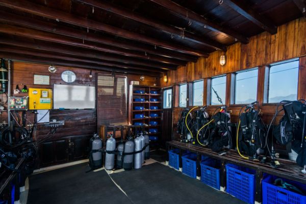 La expedición se realiza en un barco de buceo tipo vida a bordo, totalmente equipado para el confort de los buceadores. Dispone de camarotes dobles con baño privado, amplias zonas comunes, comedor, solárium y plataforma de buceo. Todo el equipo necesario —botellas, plomos y nitrox— está incluido a bordo.